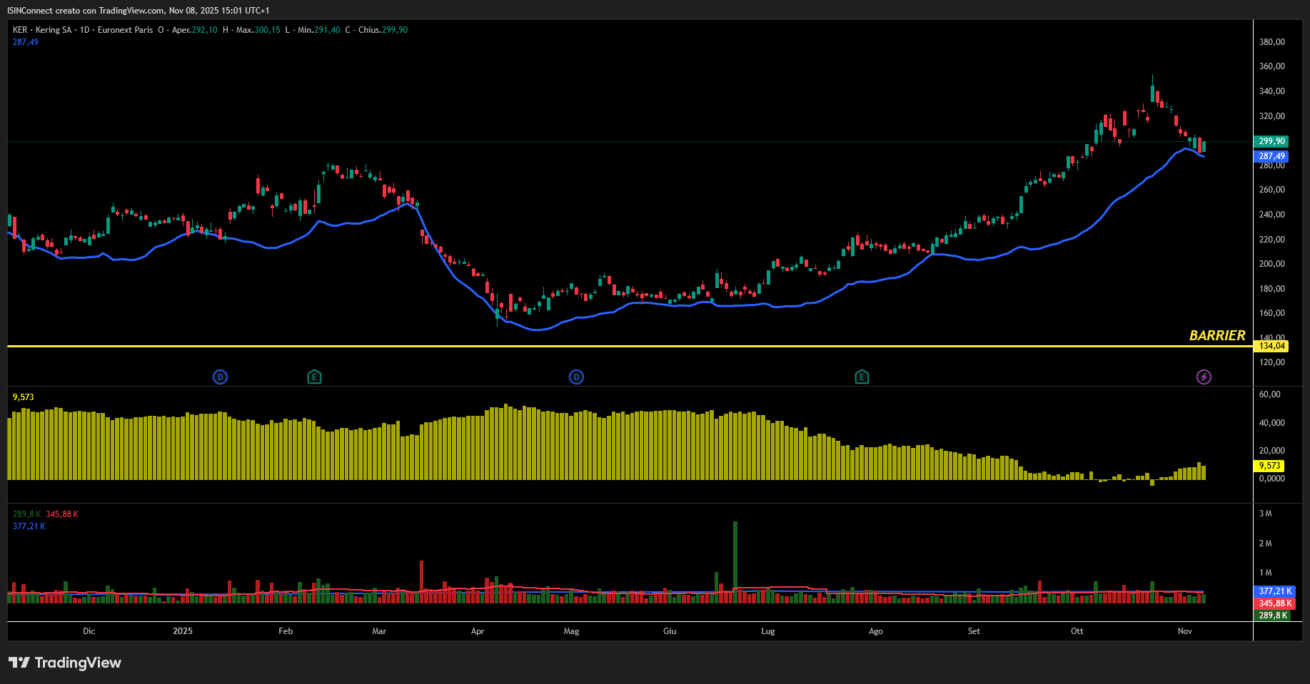 Con un buffer del 55% dalla barriera, il certificato offre ampio margine di sicurezza. Questo significa che Kering potrebbe subire correzioni significative senza compromettere la protezione del capitale a scadenza, un aspetto particolarmente rilevante considerando la ciclicità tipica del settore luxury.